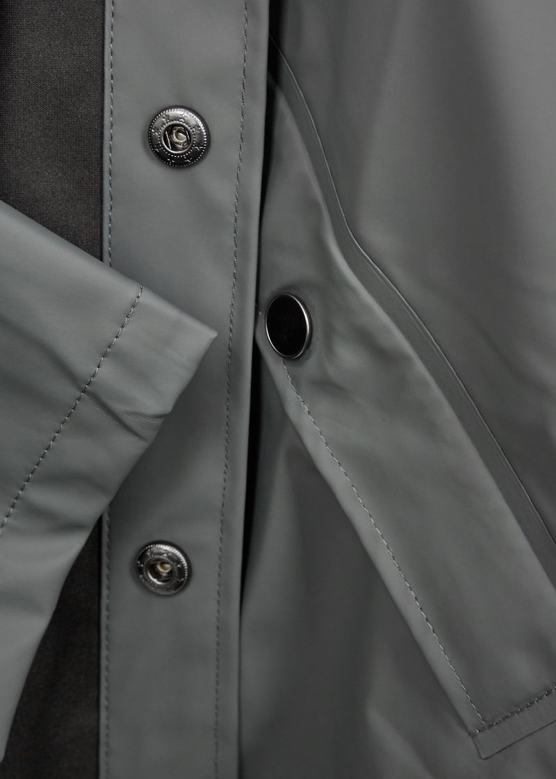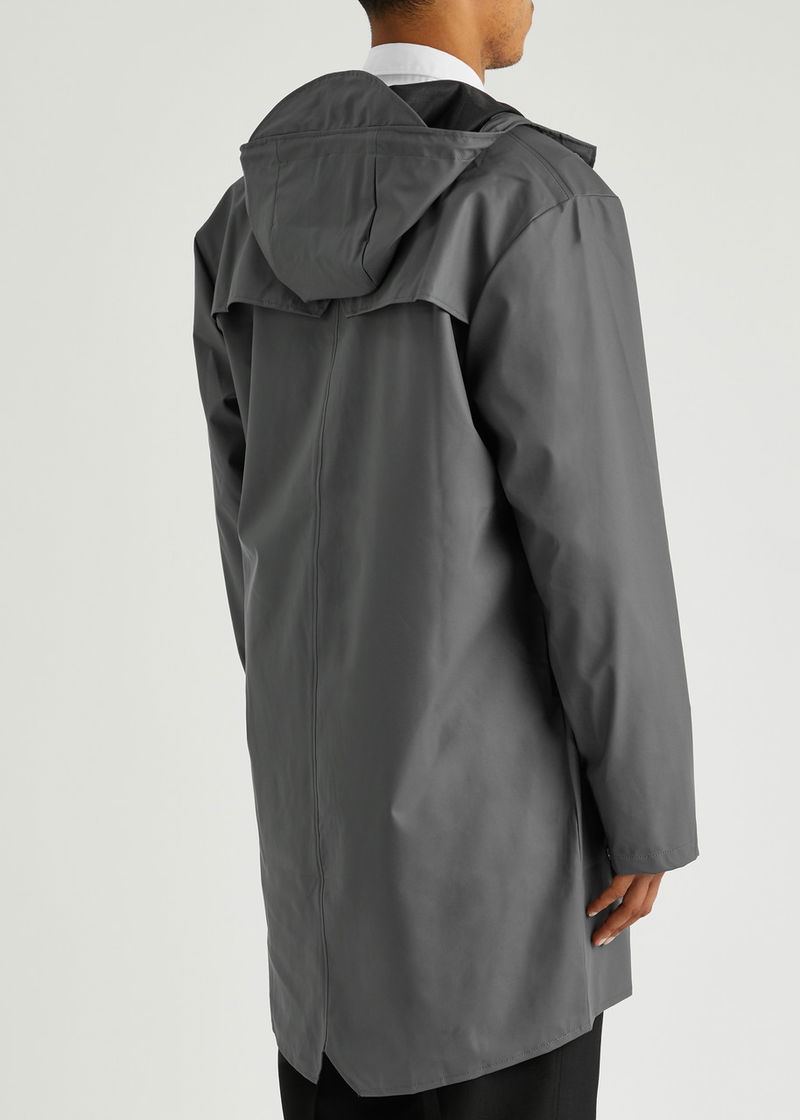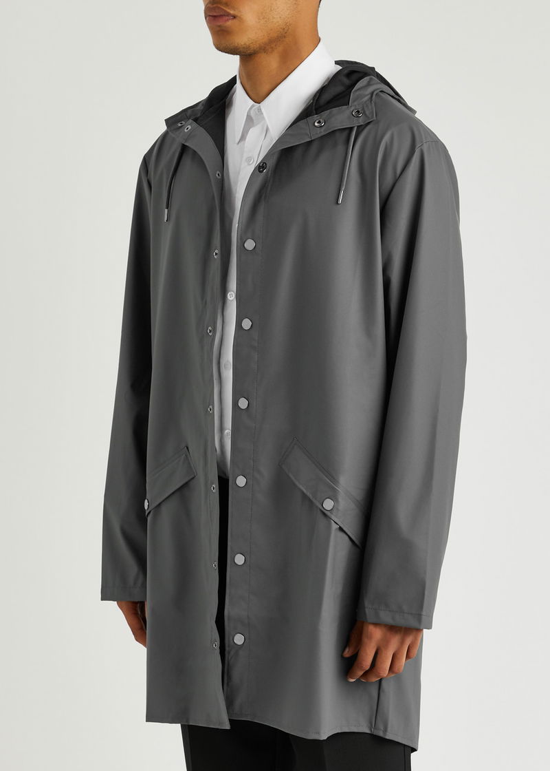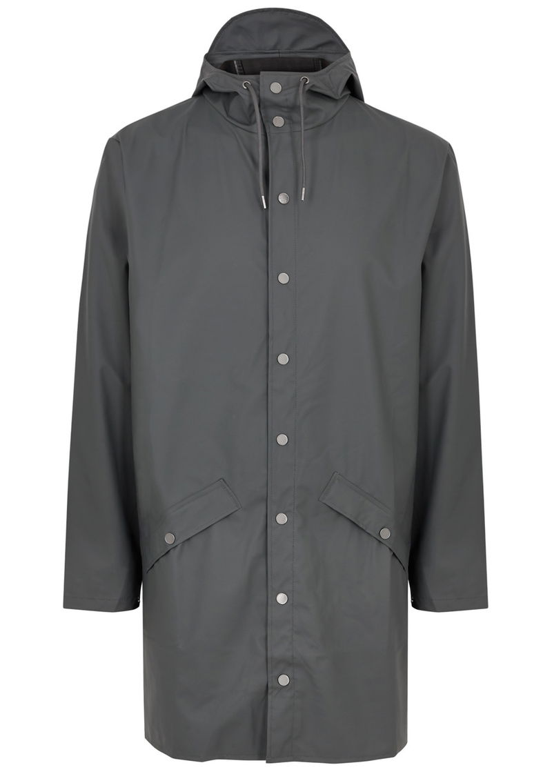 Rains matte rubberised raincoat. Waterproof, windproof, drawstring hood with peak, high-neck, dropped shoulders, press stud-fastening front pockets, press stud-fastening cuffs, underarm ventilation eyelets, back storm flap with concealed ventilation cut-outs, longer back hem, back fishtail cut-out, double-welded seams.