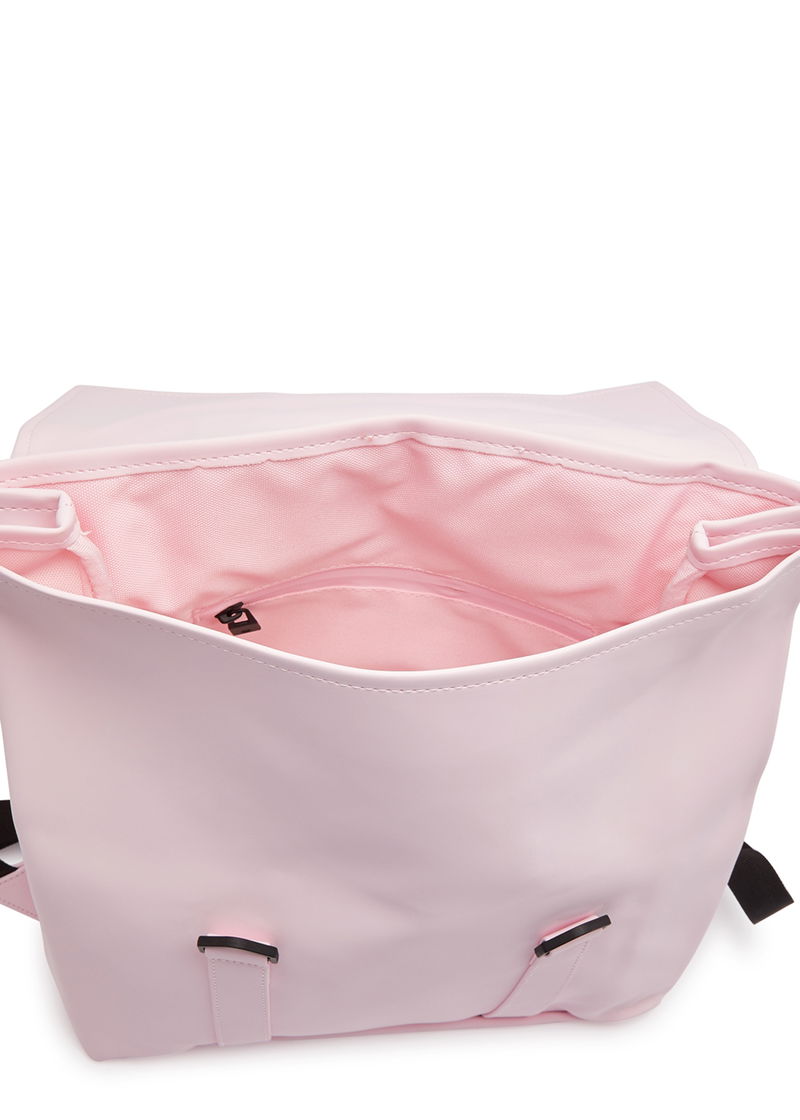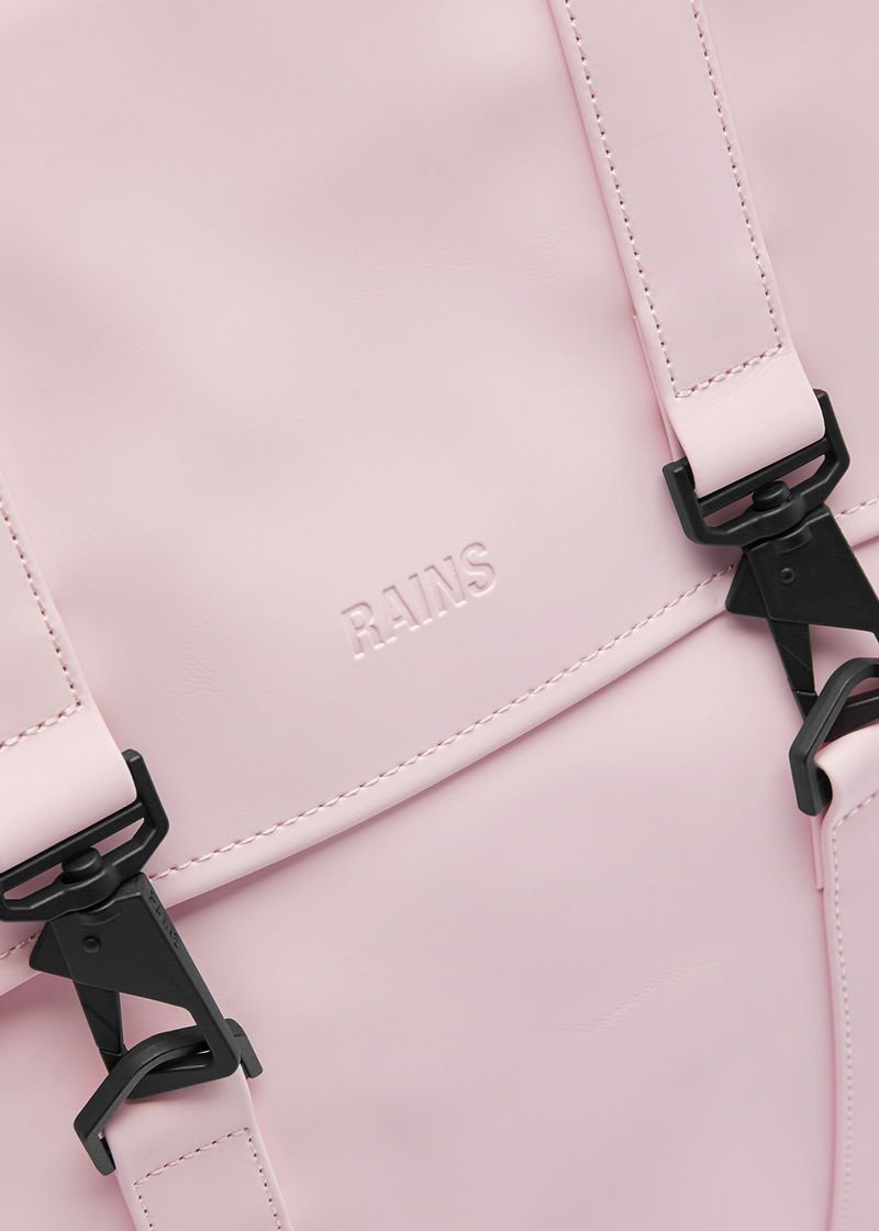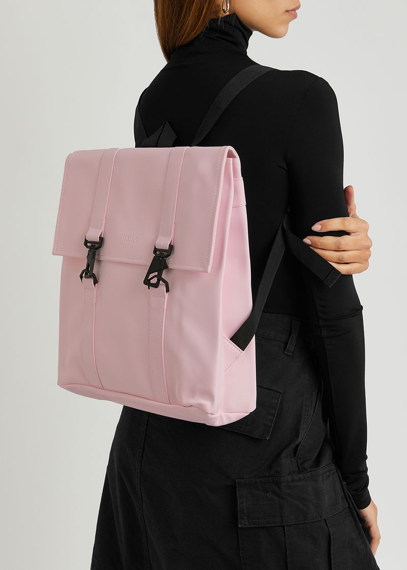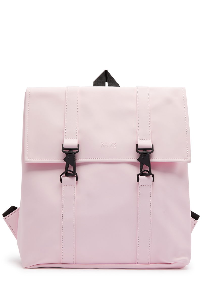 Rains rubberised backpack. Canvas top handle, adjustable canvas shoulder straps, debossed logo, press-stud fastening sides, internal zip-fastening pocket, fully lined Two lobster clasp fastenings at flap front