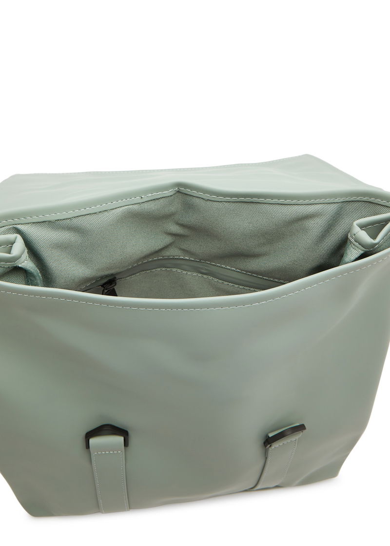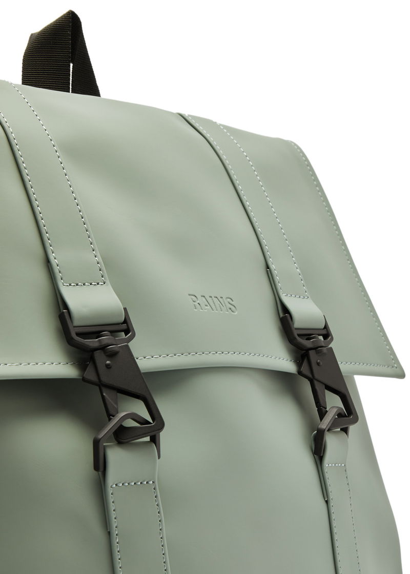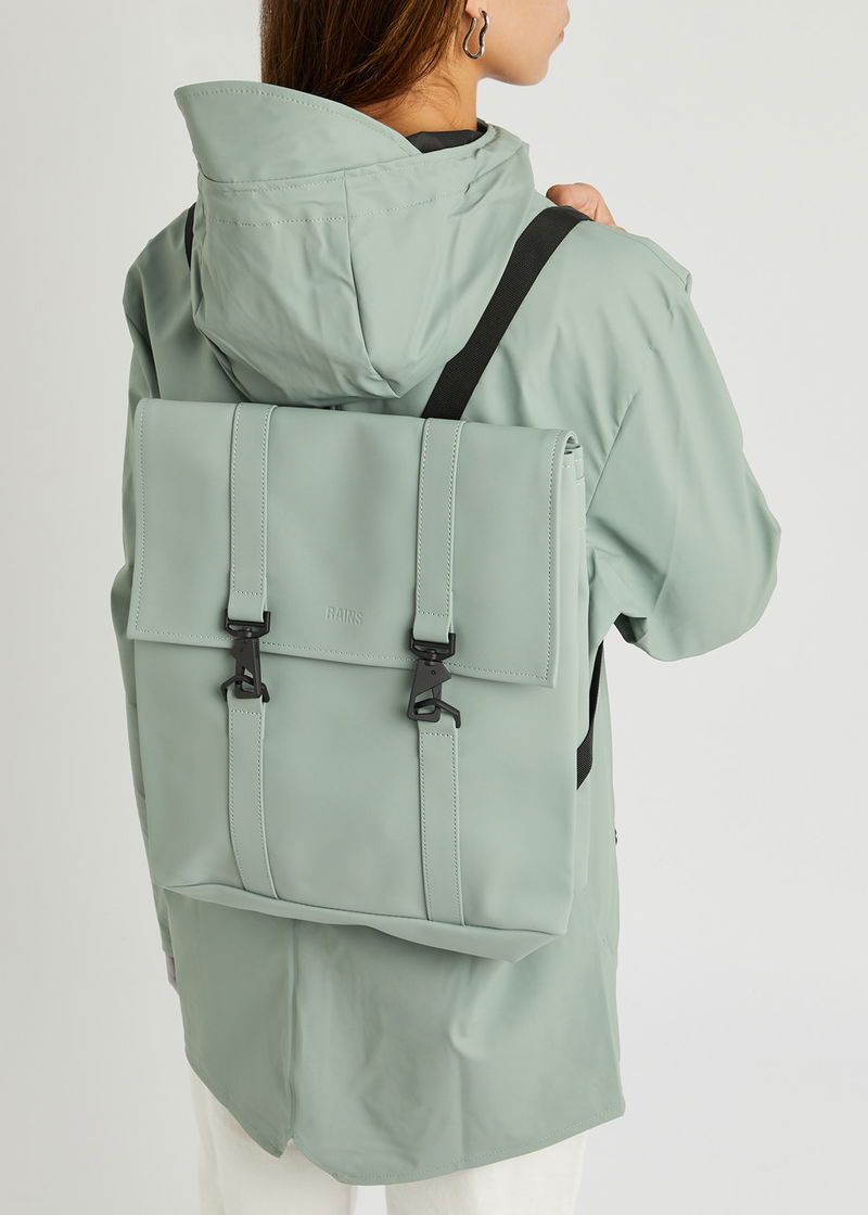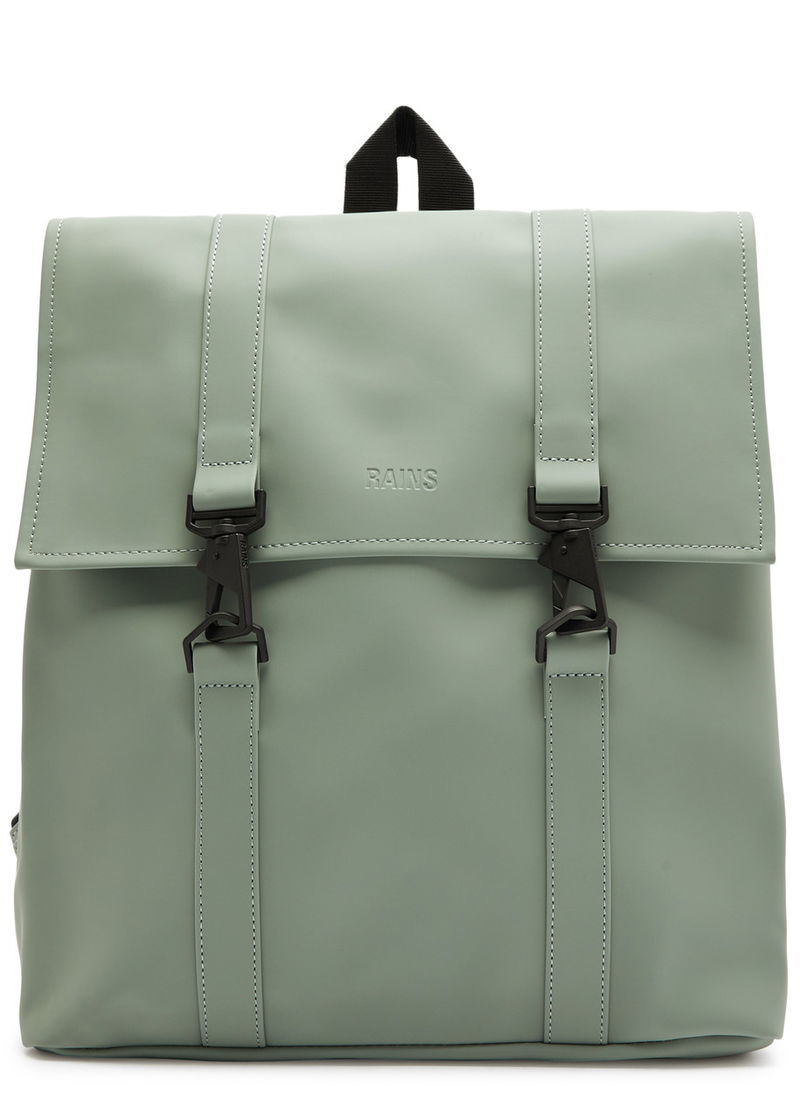 Rains rubberised backpack. Canvas top handle, adjustable canvas shoulder straps, debossed logo, press-stud fastening sides, internal zip-fastening pocket, fully lined. Two lobster clasp fastenings at flap front.