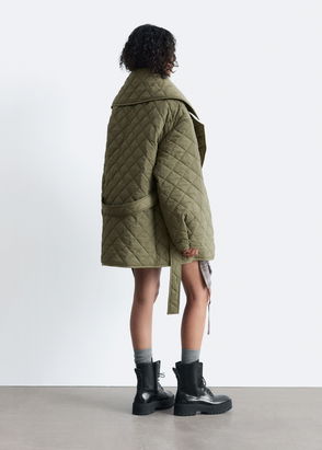 Rains rubberised jacket. Water and windproof, drawstring hood, quilted, designer plaque at sleeve, two slip pockets, ribbed cuff underlay, internal zip-fastening pocket, fully lined. Zip fastening through front.