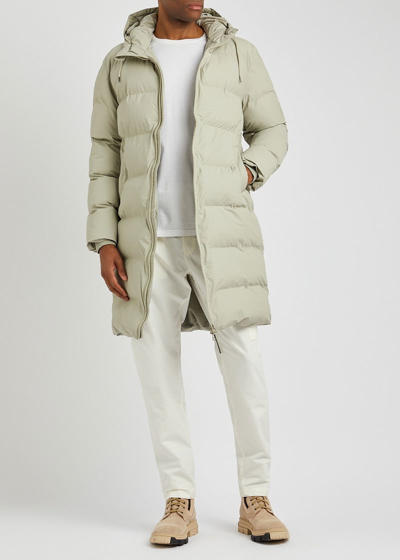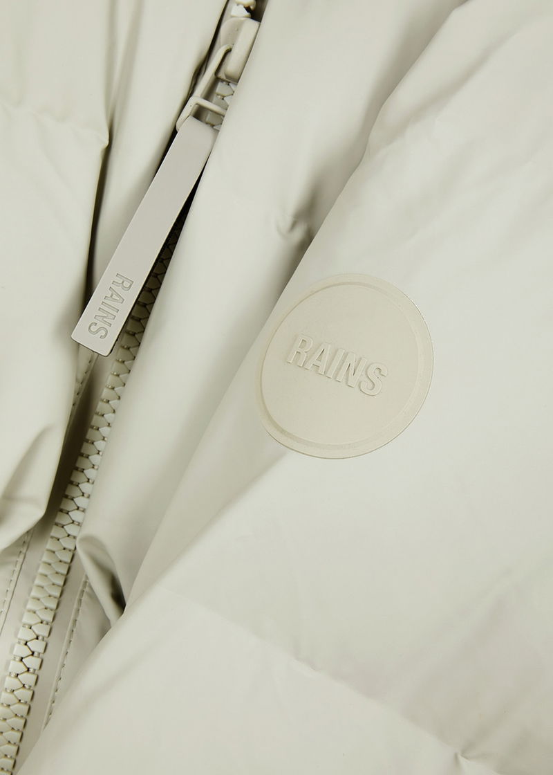 Rains rubberised shell coat. Water and wind-proof, quilted, padded, drawstring hood with peak, two front slip pockets, dropped shoulders, rubberised designer plaque at sleeve, ribbed jersey underlay at cuffs, internal zip-fastening pocket, fully lined. Two-way zip fastening through front.