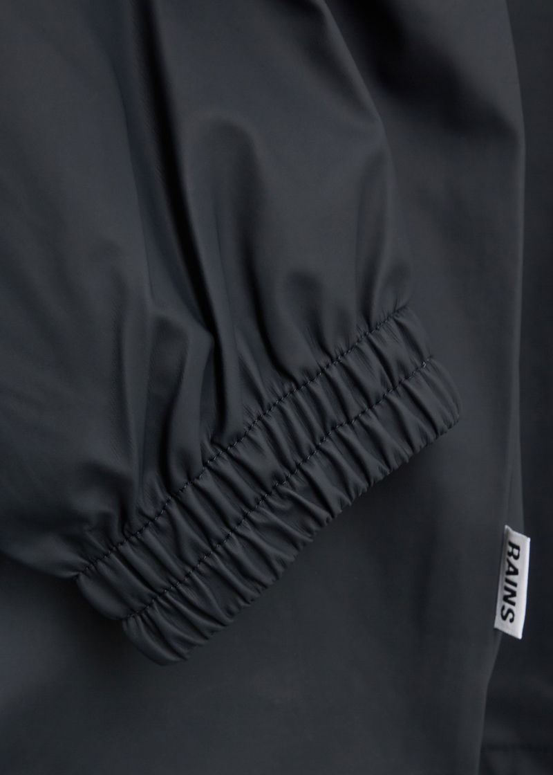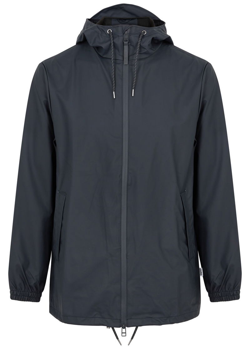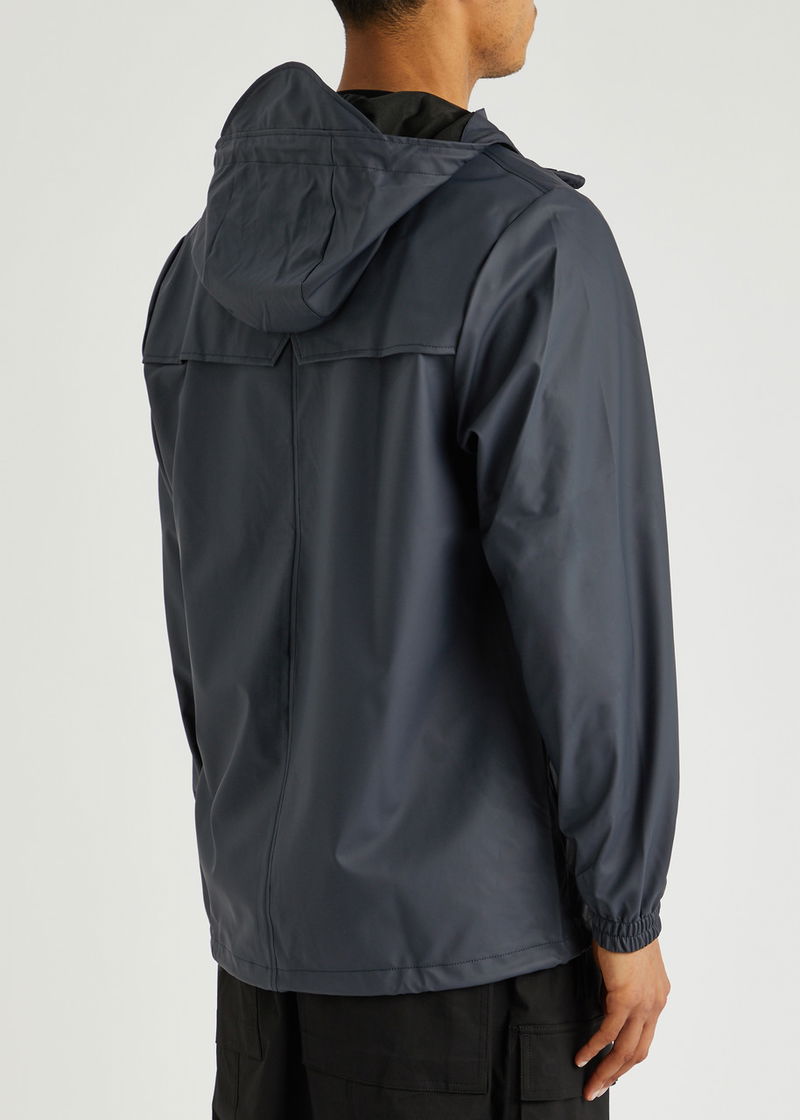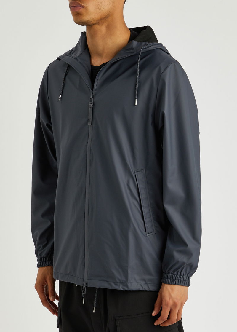 Rains rubberised raincoat. Water and wind resistant, drawstring hood with brim, high neck, dropped shoulders, elasticated cuffs, ventilation eyelets at underarms, two concealed side slip pockets, designer tag, storm flap at back with concealed cut-out details, toggle-fastening hem.
