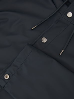 Rains shell jacket. Waterproof, windproof, padded, concealed drawstring at hood, high-neck, designer plaque at sleeve, three zip-fastening front pockets, concealed drawstring at hem, internal zip-fastening pocket, fully lined.