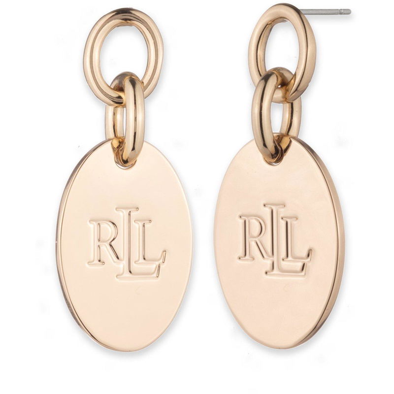 Add a touch of polished elegance to your look with these gold-tone drop earrings, featuring smooth oval discs engraved with the signature Ralph Lauren logo. Suspended from interlocking hoops, they bring effortless movement and shine, making them the perfect finishing touch for both day and evening wear. The drop earrings feature the iconic RLL monogram for a heritage-inspired finish - a refined Christmas gift for her.