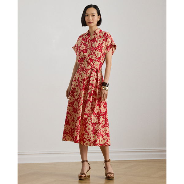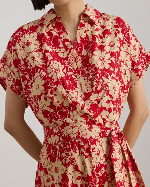 Crafted from airy crepe de chine, this dress balances a spread collar and rolled cuffs with a feminine surplice neckline to create a look that is casual yet refined. Detailed with "LRL"-engraved buttons, this version features a stylised red-and-tan floral print.