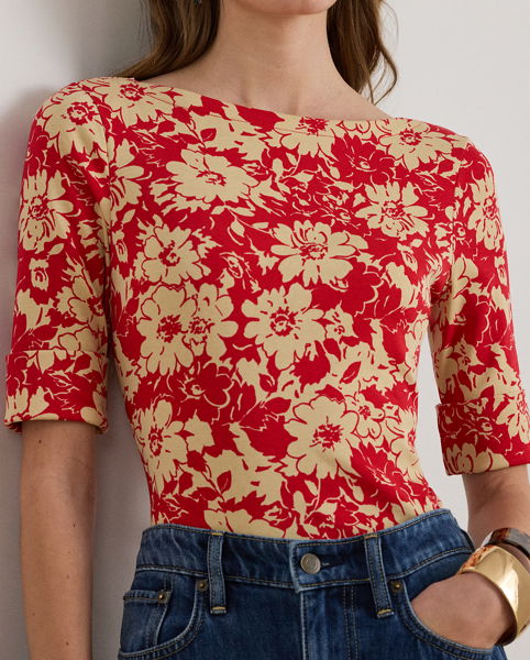 Crafted from breathable stretch cotton, this boatneck tee is enlivened by the season’s stylised red-and-tan floral print. An “LRL”-embroidered logo on the hem adds a subtle signature finish.