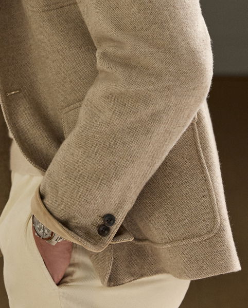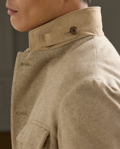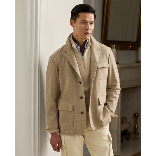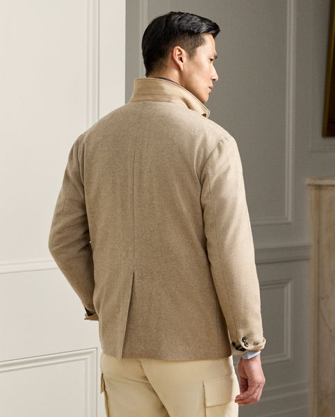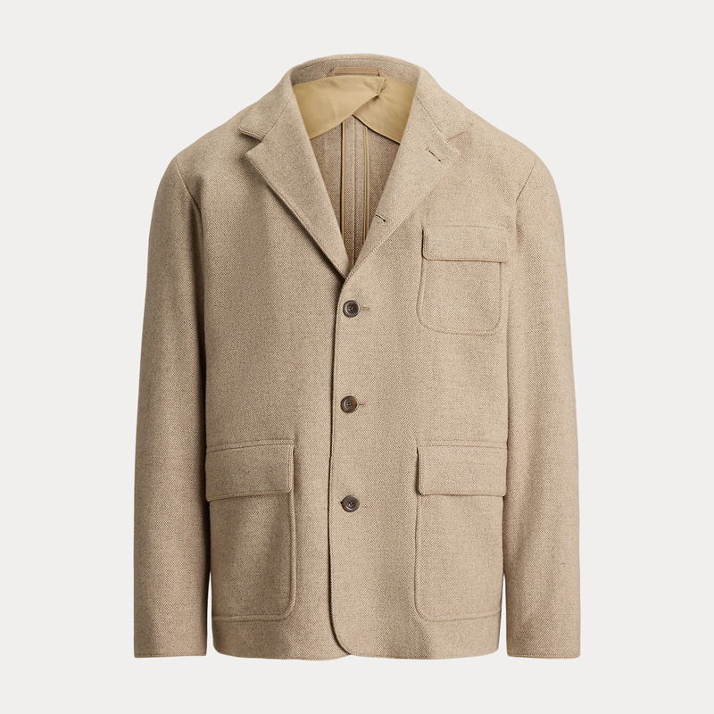 Hand-tailored in Italy, this jacket is crafted from a textured tick-weave cloth, which draws inspiration from a classic Ralph Lauren Lauren pattern. The custom-developed fabric is beautifully woven with a blend of wool, silk and cashmere.