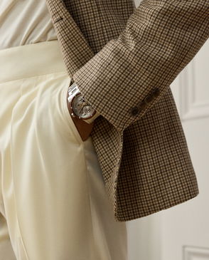 Tailored by hand in Italy, the Kent combines a lighter construction with fine canvassing and a soft shoulder to create a more natural profile. This version's fabric was custom-developed with Ireland's Magee 1866 mill, which has been a Ralph Lauren Lauren partner for more than 50 years. Its Glen plaid pattern is woven as herringbone with a distinctive overcheck using a luxurious blend of wool, mulberry silk and cashmere.