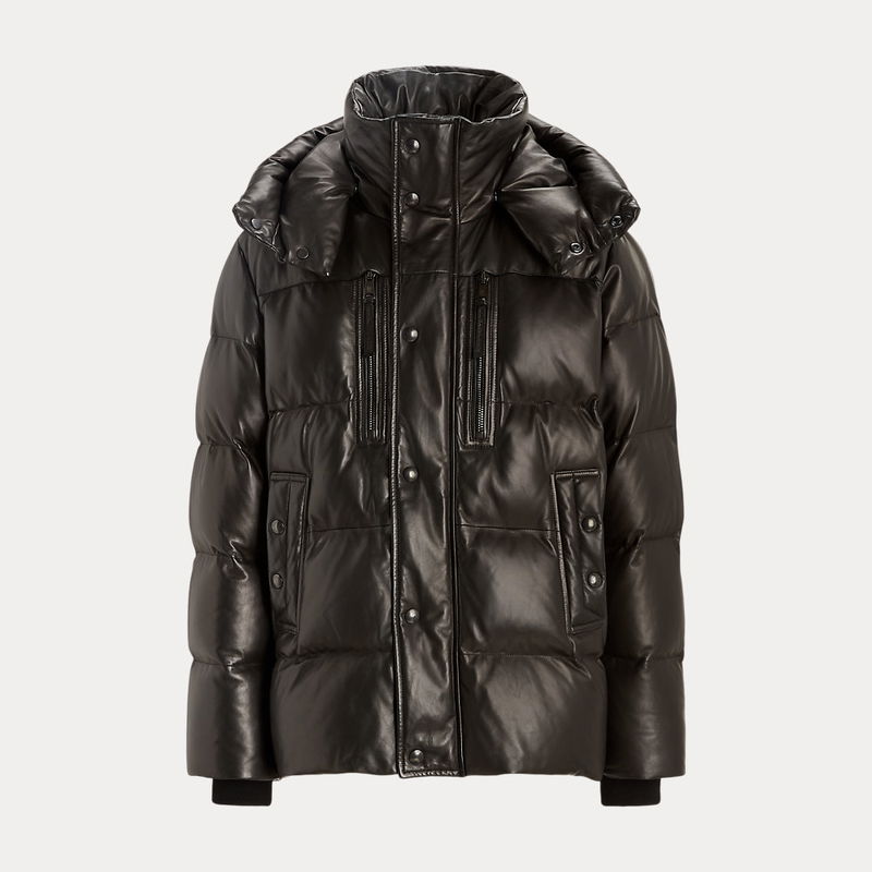 This down-filled jacket is expertly crafted in Italy with full-grain leather and constructed with a removable hood.