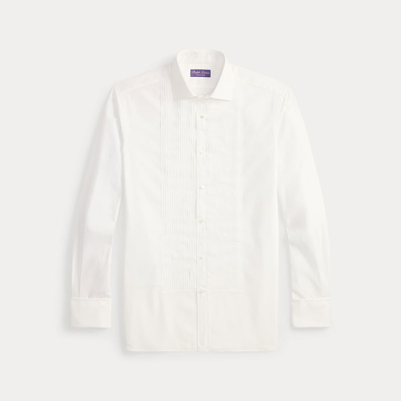 Beautifully crafted in Italy, this tuxedo shirt is the pinnacle of luxury thanks to its superior 120s-quality, two-ply poplin. This extraordinary fabric is woven from premium cotton fibres of exceptional length to achieve an unparalleled combination of softness and durability. Each refined detail – from the pleated bib to the sophisticated French cuffs and genuine mother-of-pearl buttons – reflects Purple Label's unwavering commitment to sartorial excellence and timeless elegance.