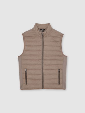 Purple Label elevates the classic quilted gilet with expert Italian craftsmanship and haberdashery-quality tweed, which is woven with wool, linen and cotton. It is insulated with 750-fill-power down and finished with suede details.