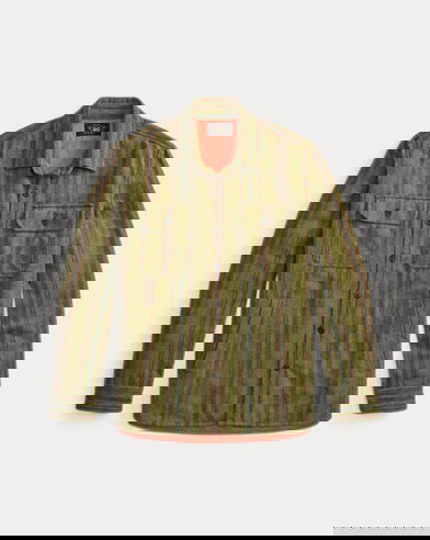 Utilitarian-inspired shirt jacket style. Made from fibre-dyed striped twill woven with a blend featuring wool and cotton. Brushed texture. Contrasting diamond-quilted ripstop interior. Insulated with a lightweight down-alternative fill. Hand-warmer pockets. Anchor-detailed buttons.