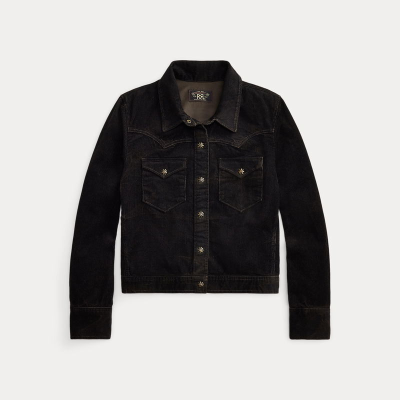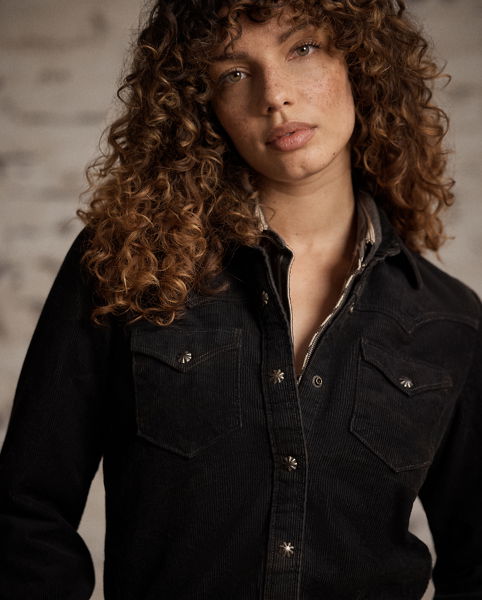 Made from cotton corduroy. Specially developed for a black-over-brown hue. Western-style yokes. Lined on the back yoke. Metal snaps.
