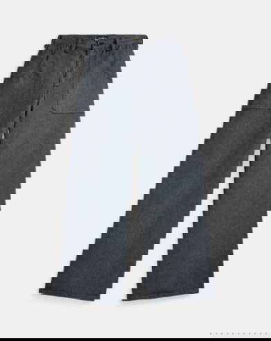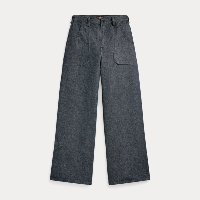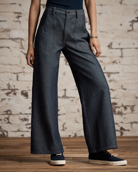 High-waisted trousers made from denim with a pronounced nep texture. Based on a vintage model. French workwear–inspired details. Corozo buttons.