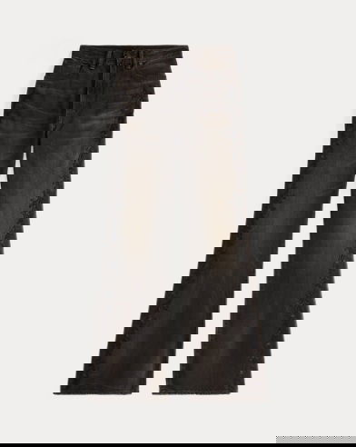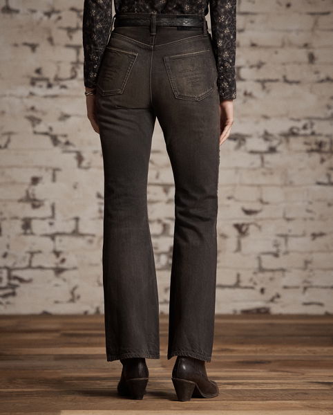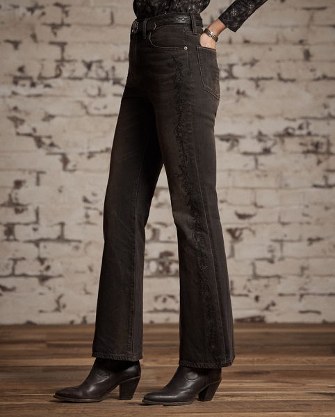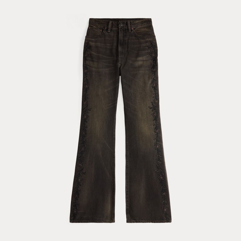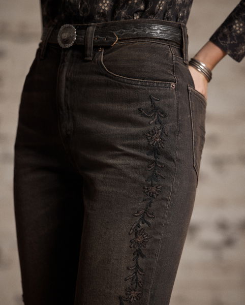 High-rise jeans made from 319 g right-hand twill. Western-style bootcut silhouette. Floral chain-stitched embroidery at the outer side of each leg. Heavily washed and tinted to achieve a warm black-brown tone and a worn-in appearance inspired by vintage denim.