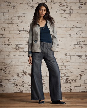 Duster jacket made with cotton jersey that is yarn-dyed with true indigo. Embroidery motifs and techniques are inspired by a 19th-century French garment. Corozo buttons.