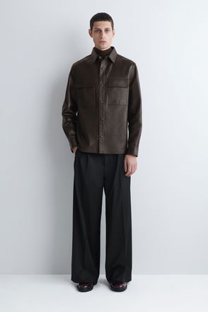Made with black-over-brown sheepskin. Overshirt model with detailing inspired by vintage leather jackets. Hand-distressed for a lived-in feel. Two chest pockets and side on-seam pockets. Custom snaps.