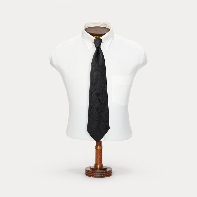 Tie shape is based on neckwear from the 1940s and 1950s. Handmade in Como, Italy. Silk-and-wool cloth is jacquard-woven with a floral motif.