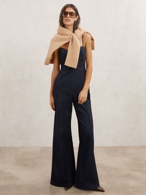 Coverall made with Japanese denim woven with a hint of stretch. Dyed with true indigo and rinsed. Designed with a point collar, buttoned front and expansion pleats on the front panels. Finished with an adjustable buckled back.