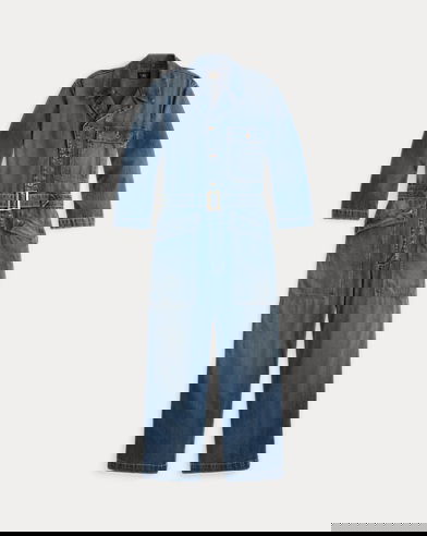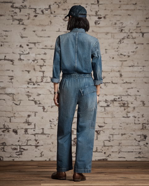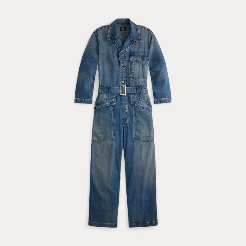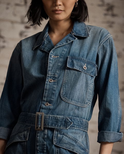 Relaxed-fitting, lightweight coverall made with 11 oz. denim from Japan. Yarn-dyed with indigo. Details inspired by a vintage surplus garment from the 1940s. Buckled self-belt. Sanforized to minimise shrinkage. American-made metal buttons. Heavily washed and abraded for a worn-in look.
