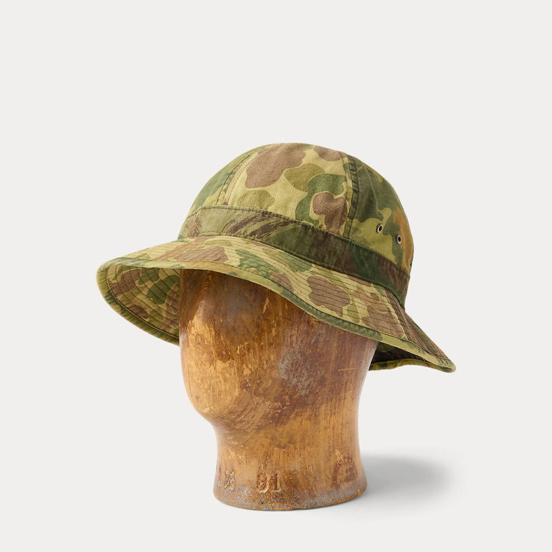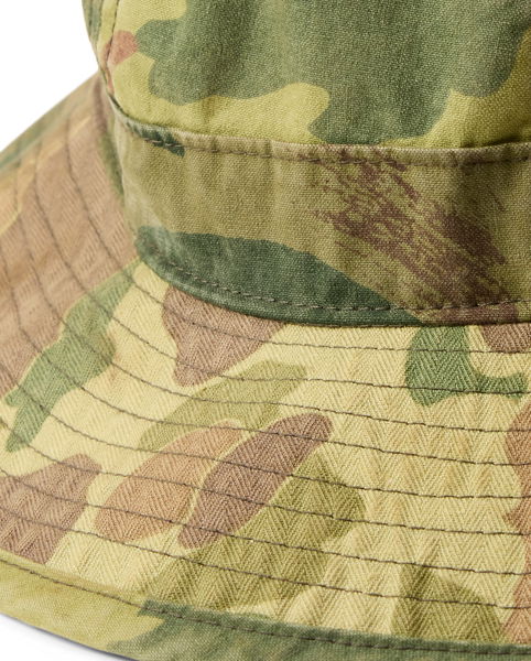 Bucket hat featuring vintage-inspired camo motifs, crafted from herringbone twill, ripstop and poplin. Metal grommets on the sides for ventilation. Heavily abraded and pigmented for a worn-in look. Edition of 270.