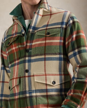 Fibre-dyed double-knit jacquard made with a wool blend. Brushed texture. Plaid pattern and colour palette inspired by a vintage swatch. Woven reinforcements on the interior. Chamois lining in the hand-warmer pockets. Corozo buttons.