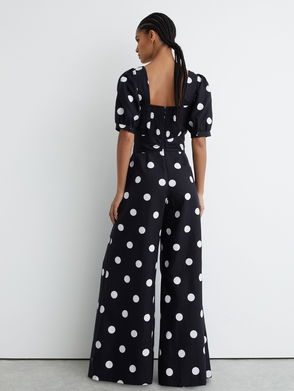 Wide-leg jumpsuit with a wrap bodice. Polka-dot silk crepe has a matte finish. Modelled after a vintage garment. Side-on-seam pockets. Unlined. Comes with a buckled self-belt.