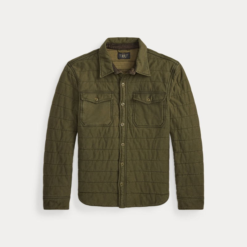Utilitarian-inspired overshirt modelled after an archival Double RL Outerwear piece. Jersey exterior is made with high-twist cotton yarns. Waffle-knit lining. Channel-quilted design. Overdyed in garment form and washed.