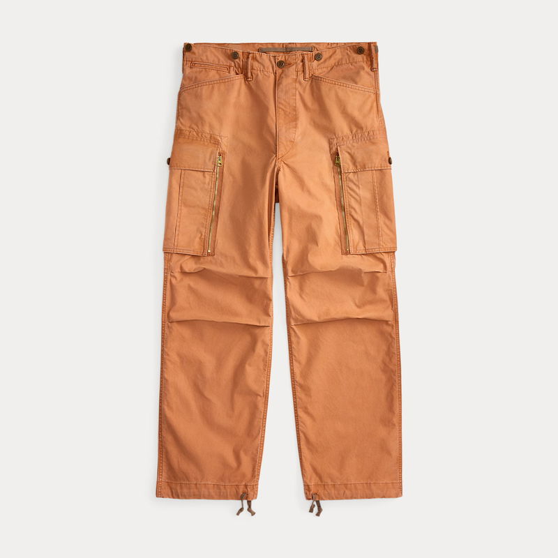 Wide-leg cargo trousers made with cotton poplin. Reinforcement at the seat. Drawstring hems. Heavily abraded and pigmented for a worn-in look.