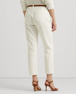 High-waisted jeans made from 11 oz. Japanese denim. Right-hand twill is dyed with true indigo. Repaired with workwear-inspired striped fabric. Details based on models from the 1950s. Adjustable buckled back. Vintage-style metal buttons. Heavily washed and distressed for a lived-in look.