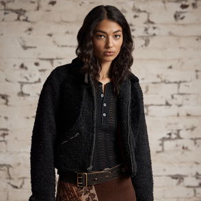 Sueded sheepskin jacket with a waist-length fit. Accented with chest pockets and Western-style yokes. Snapped placket and cuffs.