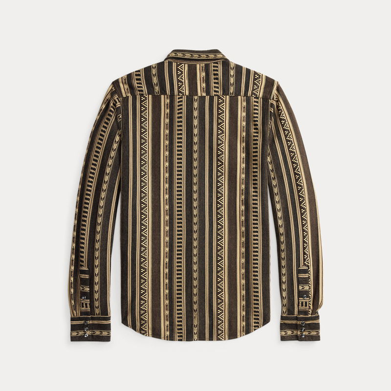 Slim-fitting Western shirt made with heathered cotton jacquard-knit fabric. Sueded finish. Western-style front and back yokes. Pearlescent snaps.
