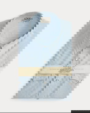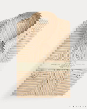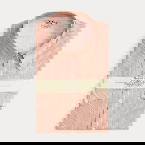 Slim-fitting shirt made from yarn-dyed striped twill. Cotton fabric has a soft drape. Western-style front and back yokes. Metal button on the collar.