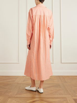 Ankle-length dress inspired by a Victorian garment. Lightweight cotton voile is detailed with hand-smocking on the bodice, hips and cuffs. Ruffle trim on the hem.