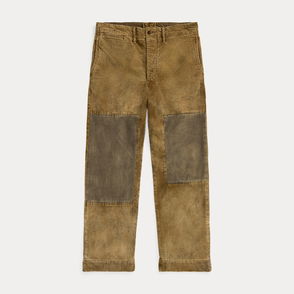 Wide-wale corduroy sourced from a storied French mill that has been specialising in corduroy since the 1800s. Button fly. Japanese chambray piecing throughout. Distressed and repaired.