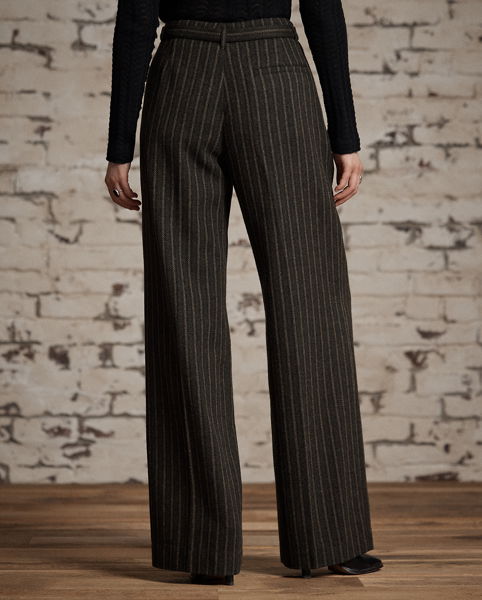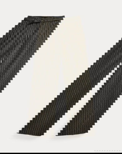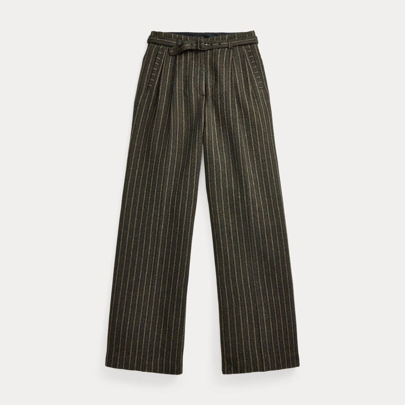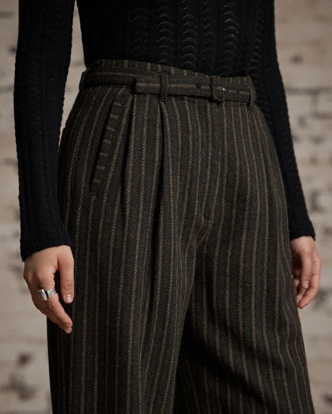 Pleated trousers made from wool-and-cotton twill cloth. The fibre-dyed, yarn-dyed fabric has been custom-developed with a storied British mill. Antique-inspired striped pattern. Based on a vintage model. Comes with a buckled self-belt.