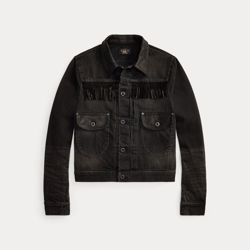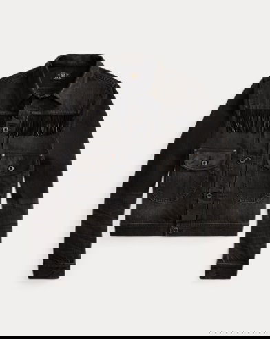 Vintage-inspired jacket made from black denim. Right-hand twill is heavily tinted and abraded for a worn-in look. Suede collar and fringe trim. Western-style decorative stitching on the pockets. Adjustable buckled back. Unlined. Sanforized to minimise shrinkage. American-made metal buttons.