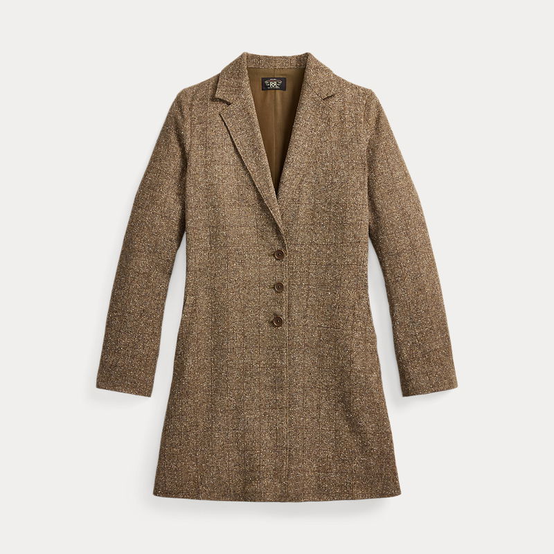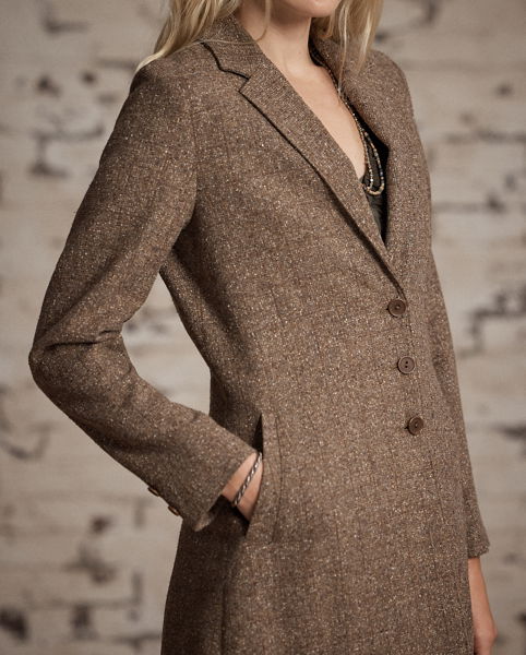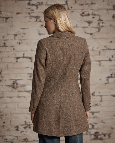 Vintage-inspired model based on an equestrian hacking jacket. Tweed cloth was custom-developed with a storied British mill using wool, silk and cotton. Subtle windowpane pattern. fully lined. Corozo buttons.