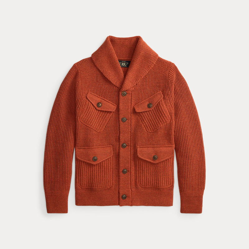 Shawl-collar cardigan made from wool and cotton yarns, which are pre-twisted together to create a heathered effect. Knit using a half-cardigan stitch with racking details on the collar and placket. Four pockets on the front. Rib-knit cuffs and hem. Genuine horn buttons.