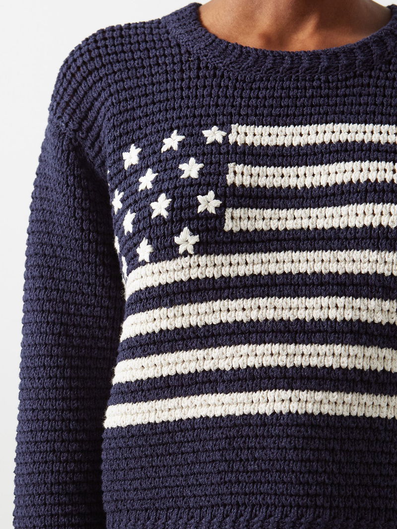 Re/Done’s navy ribbed cotton-blend sweater features a white jacquard American flag that pays homage to the label’s Californian heritage.