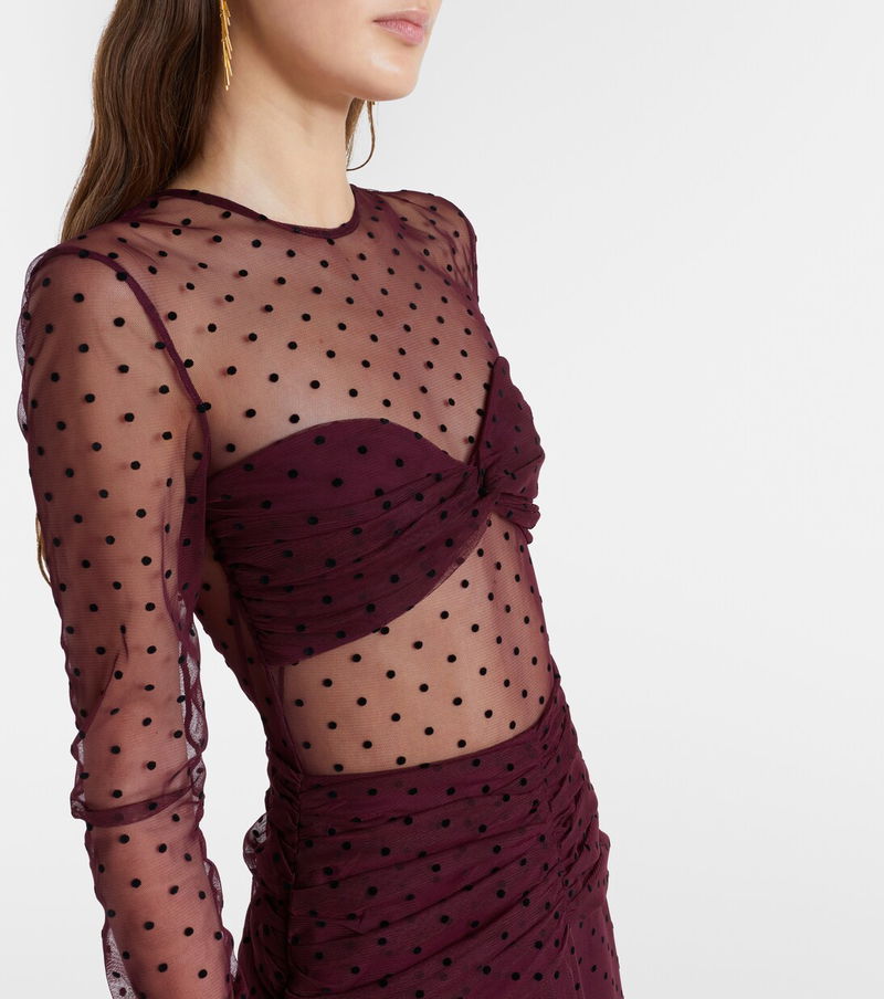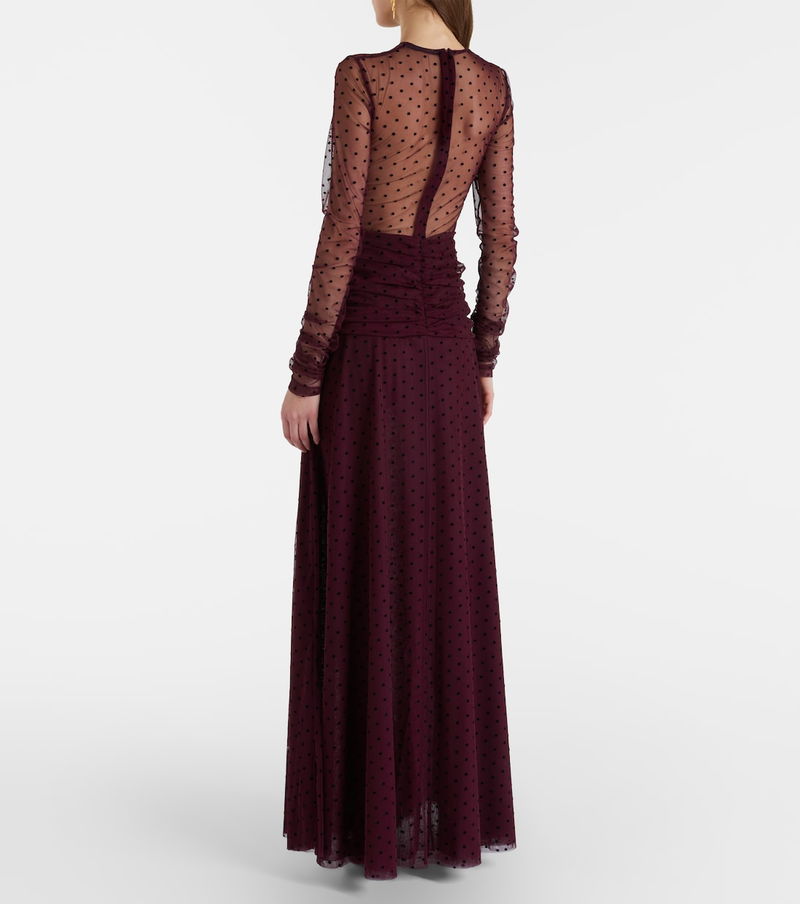 Every style from Rebecca Vallance is characterized by glitz and glamour. Made from point d'esprit tulle, the Barbera gown features a sheer bodice and a flowing skirt with ruched detailing and a deep slit.
