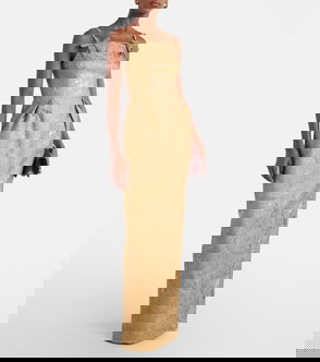 Rebecca Vallance's Genevieve gown has an off-shoulder neckline with a V-shaped cutout and voluminous puff sleeves. Made from crêpe, this floor-length design has a fitted waist and a mermaid hem.