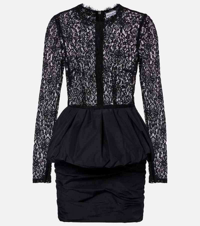 Every style from Rebecca Vallance is characterized by glitz and glamour. The Dixie minidress features a peplum taffeta skirt and a cotton-blend lace bodice adorned with a floral motif.
