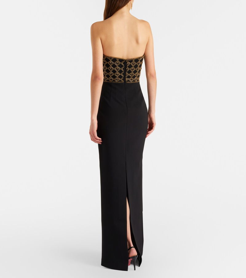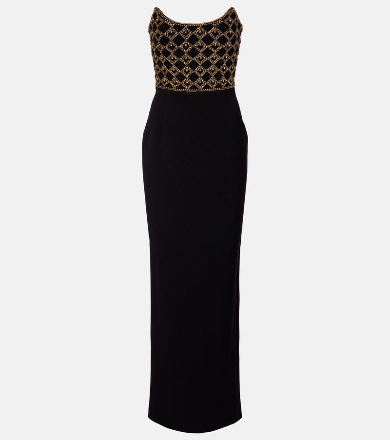 The Vesper corset gown by Rebecca Vallance celebrates opulence in its purest form. Intricate glass and brass embellishments enrich the corset, creating a striking interplay between black and gold.