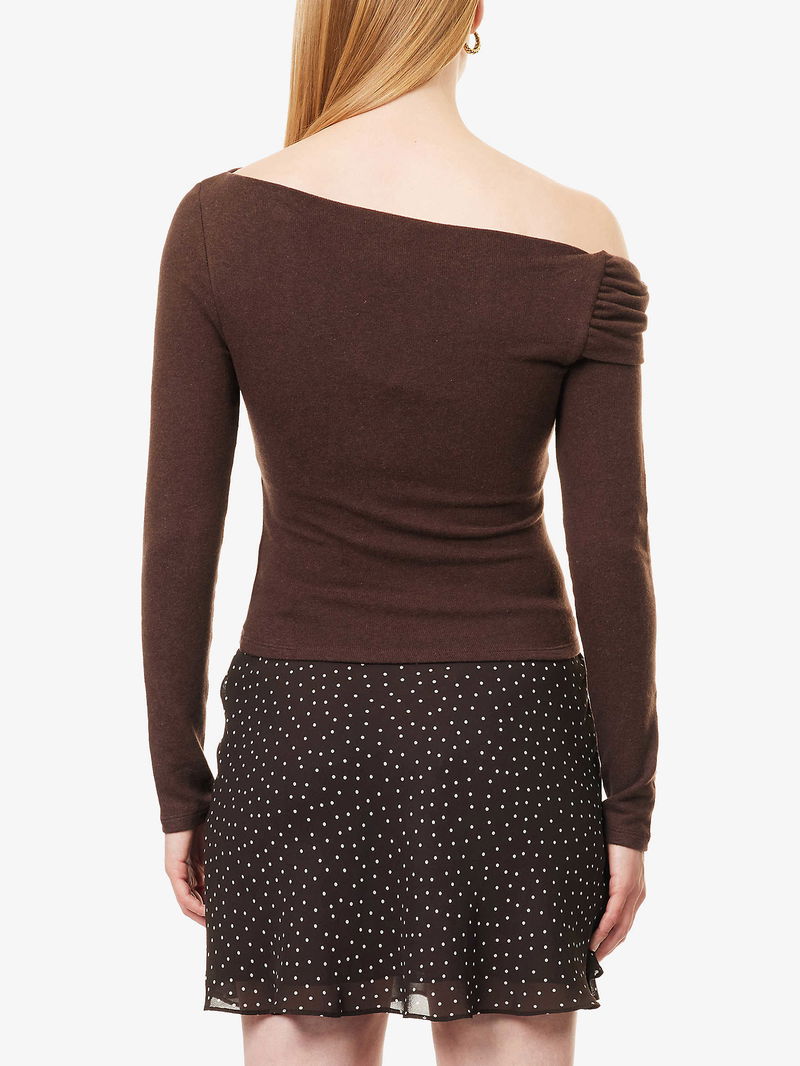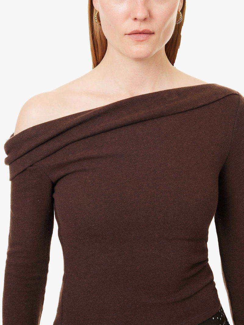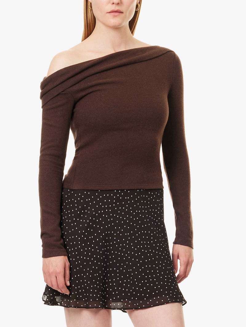 Reformation knitted top. Slim fit, asymmetric off-shoulder neckline, fold-over at neckline, long sleeves, brushed texture.