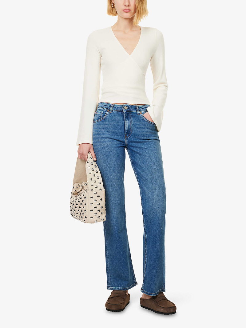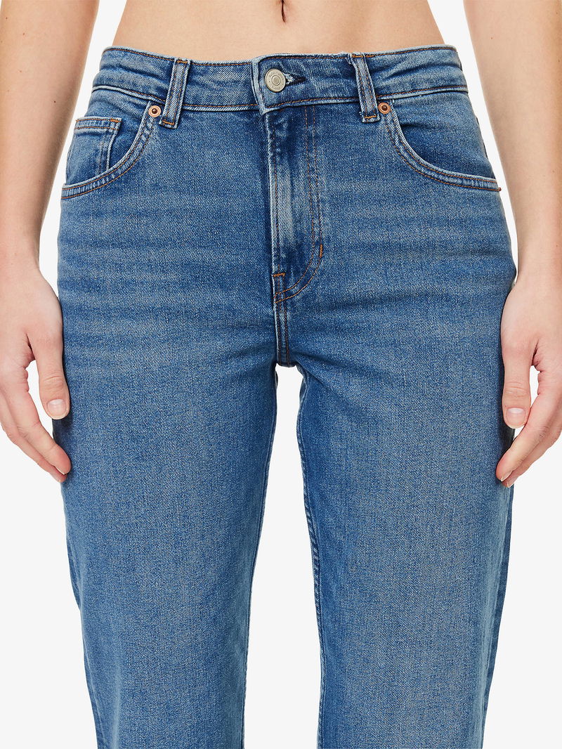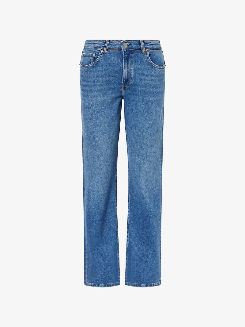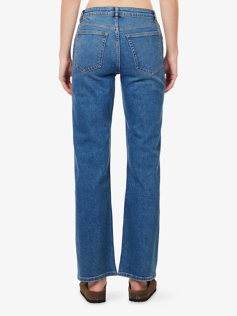 Reformation stretch-denim blend jeans. Exposed button and concealed zip-fly fastening at front. Slim fit, mid-rise, straight leg, belt loops, five pockets, faded wash and whiskering.
