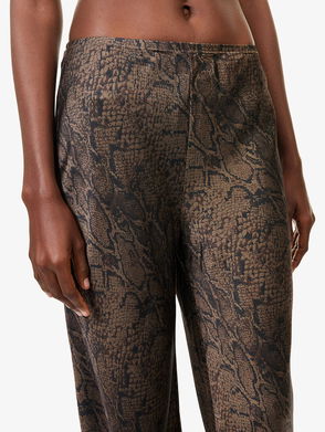 Reformation satin trousers. Relaxed fit, mid-rise, elasticated waistband, straight leg, bias cut, satin finish.
