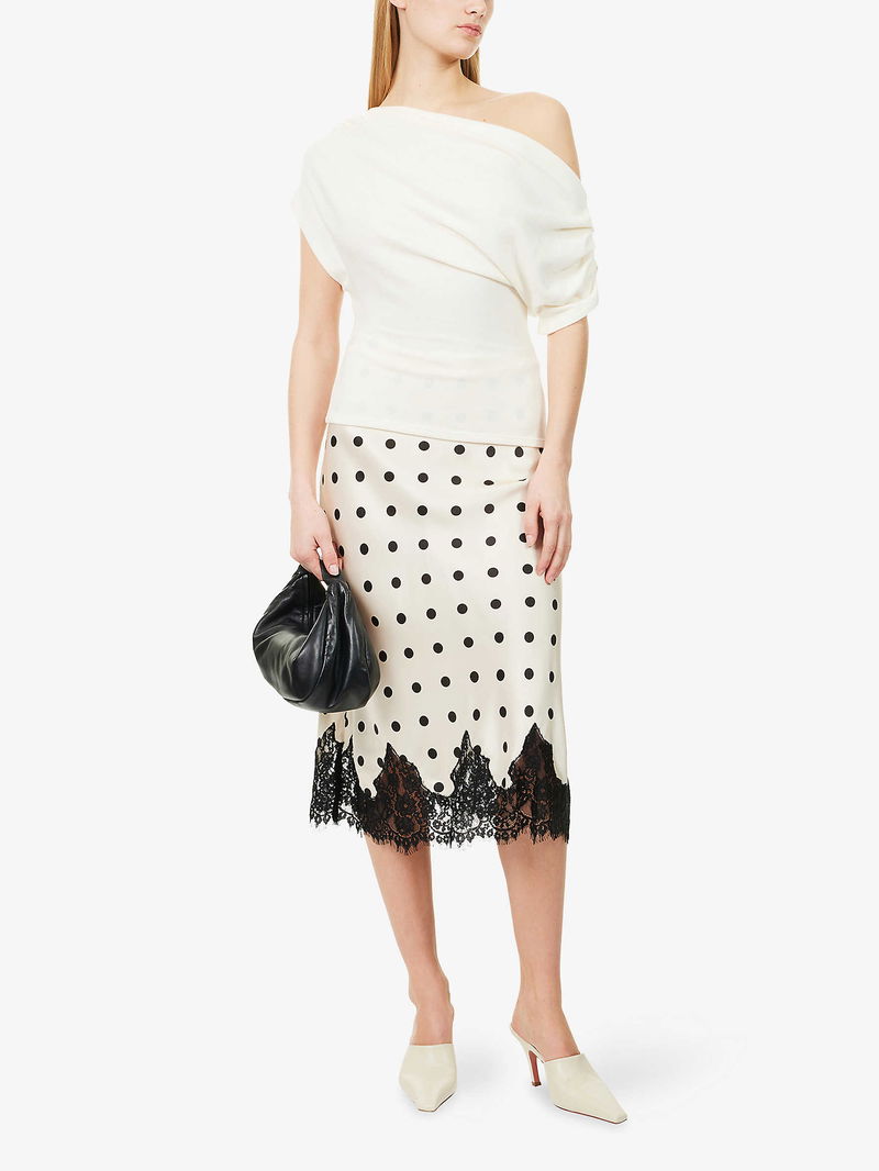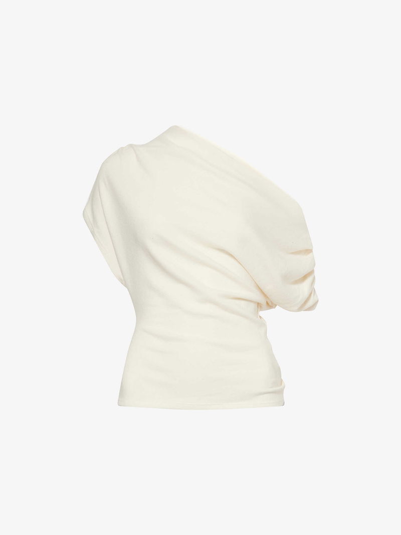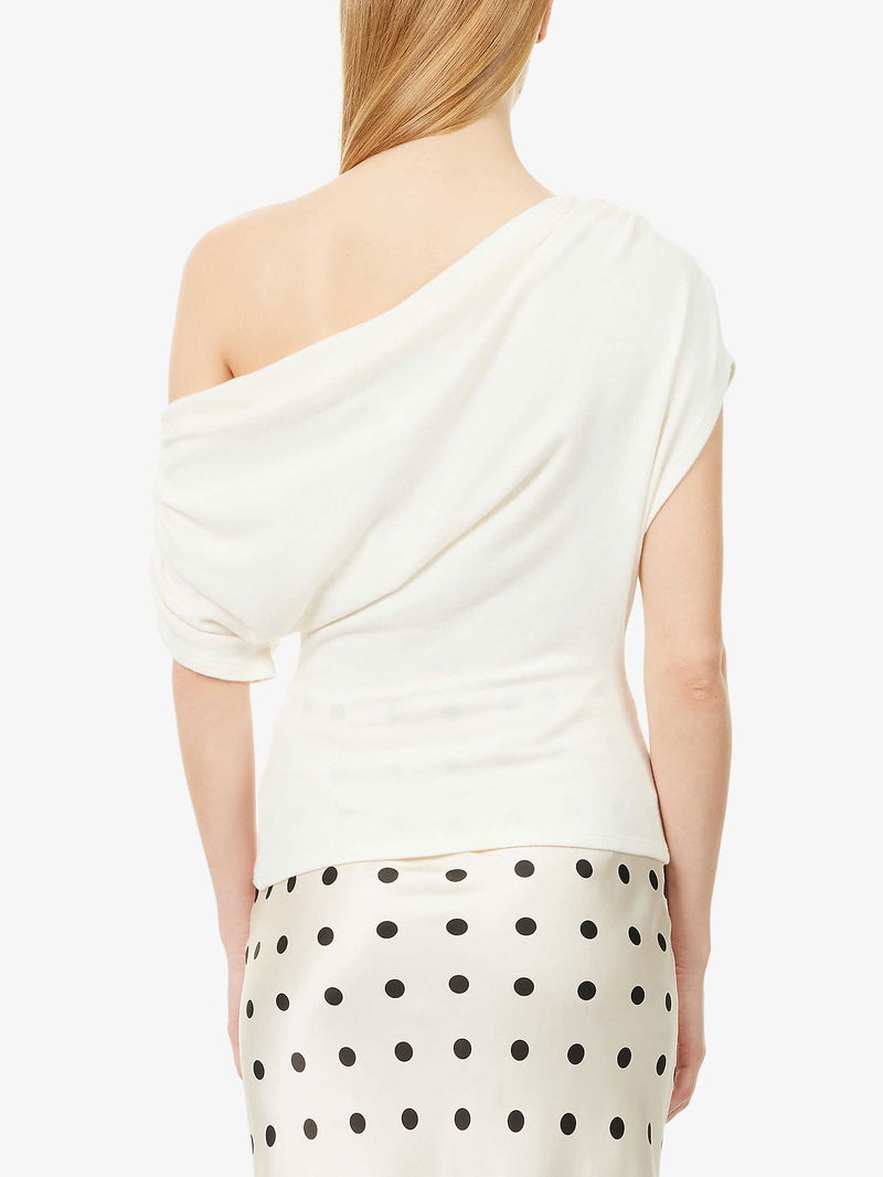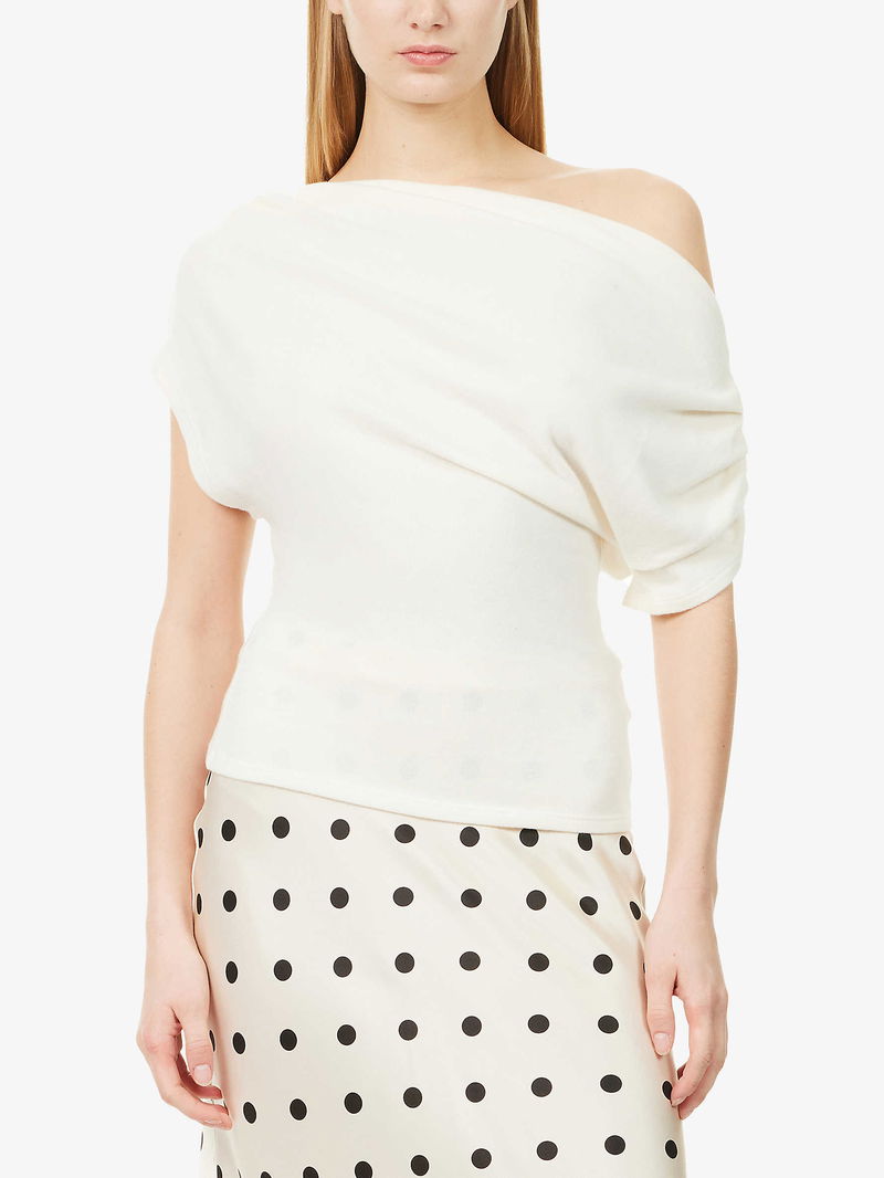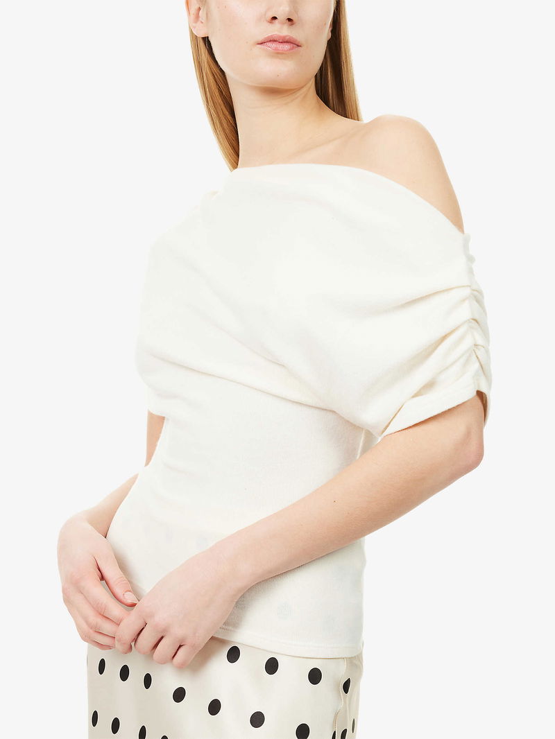 Reformation knitted top. Fitted, off-shoulder, short sleeves, gathered at one sleeve.