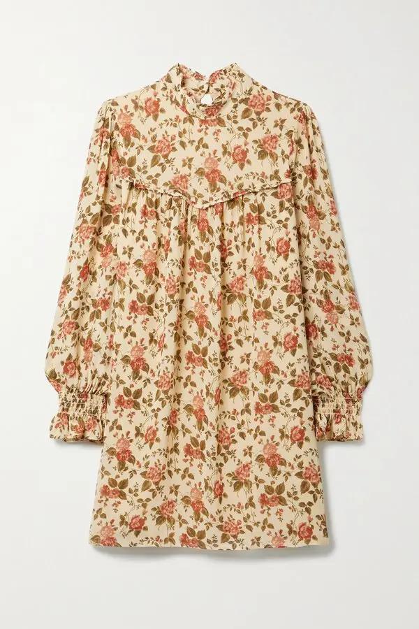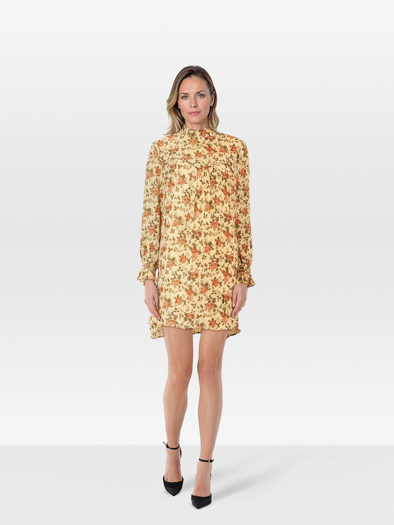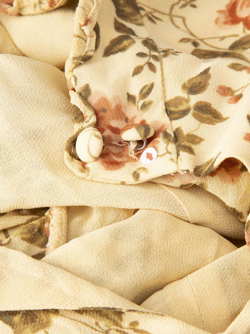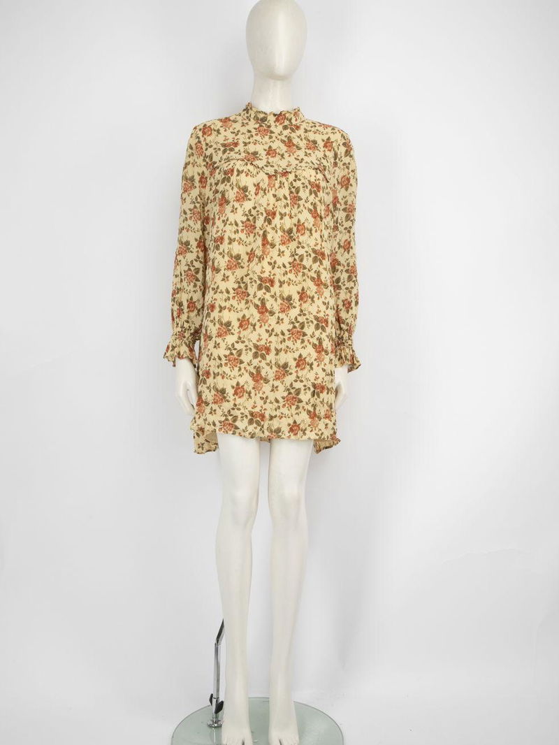 Beige floral print dress in excellent, pre-worn condition with long sleeves, ruffle trim mock neck and back button fastening.