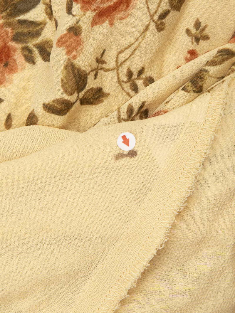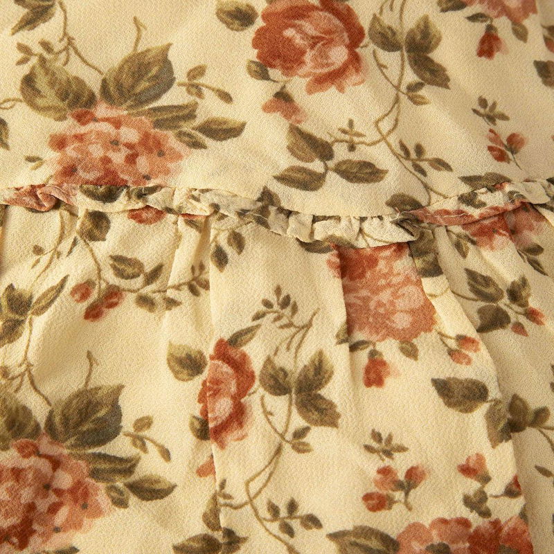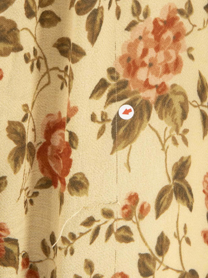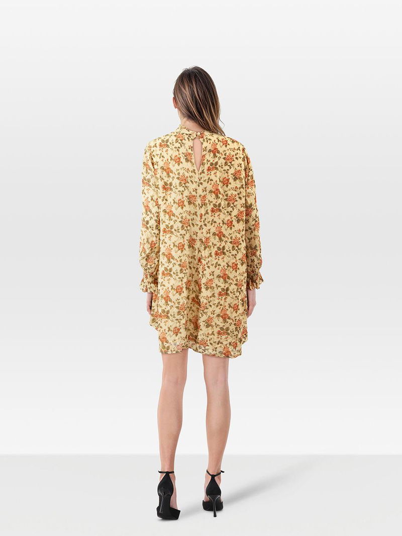 Beige floral print dress in excellent, pre-worn condition with long sleeves, ruffle trim mock neck and back button fastening.